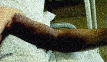 фиг. 4Проявление (Клинична картина)Типично след 1-3 дневен инкубационен период след ухапването на кърлежа или 5-6 дни след излагане на инфектирана кръв, тъкани или телесни течности се развиват симптоми, подобни на грипните (обща отпадналост, артралгия, миалгия, повишена температура), които могат да отшумят след около седмица. При повече от 75% от случаите обаче хеморагични симптоми настъпват 3-5 дни след първоначалното неразположение. Същевременно настъпват промени в настроението, емоционални промени (възбуда, екзалтираност), загуба на ориентация, загуба на паметта, петехии (малки точковидни кръвоизливи) в областта на гърлото. Скоро след това се появява кръв в урината, гадене, гастро-интестинални хеморагии. Черният дроб при палпация е уголемен и болезнен. Възможно е да се появят интраваскуларни съсиреци в кръвоносните съдове (следствие на абнормалната коагулация) и кървене по повърхността на кожата (обикновено местата откъдето са взети кръвни проби), отказ на бъбреците и шок, а понякога настъпва остър респираторен дистрес синдром (възпаление на белодробния паренхим, водещо до непълноценна газова обмяна, отделяне на медиатори на възпалението в организма, хипоксия и често се достига до отказ на множество от вътрешните органи).